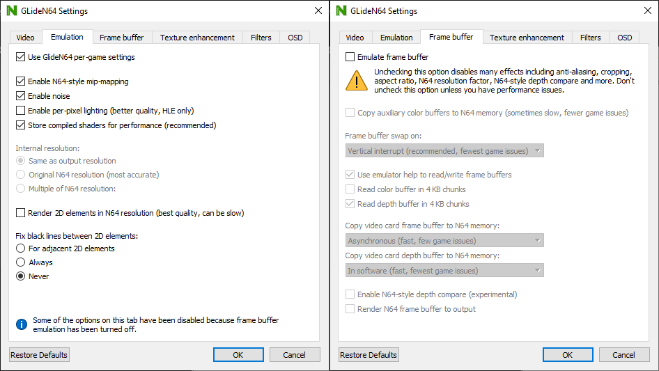 Una versión más antigua de GLideN64. Comparada a la versión nueva, le faltan algunas características (tales como relación de aspecto con framebuffer desactivado), de todas maneras tiene buena compatibilidad con romhacks y es menos exigente en recursos. Resolución 720p es recomendada para evitar artefactos visuales casuados por framebuffer.